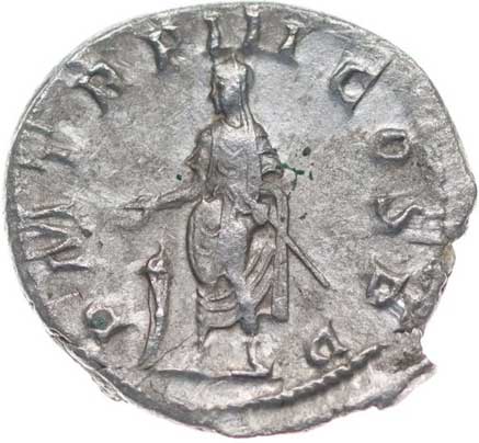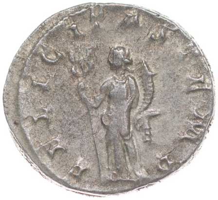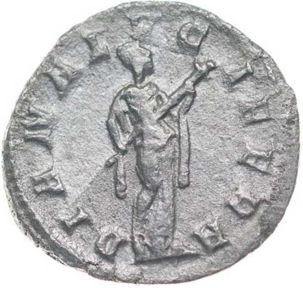 117. AR Antoninianus, Rv:"LAETITIA.AVG.N.", stojící Laetitia zleva