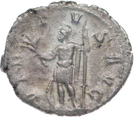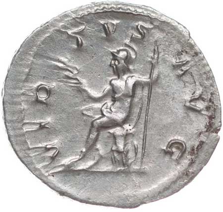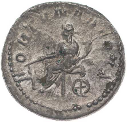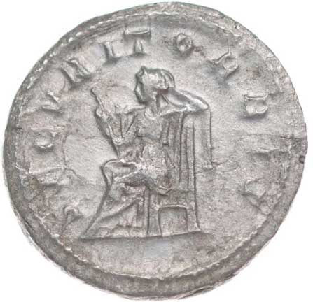 166. AR Antoninianus, Rv:"VIRTUS AVGG.", sedící Virtus zleva,