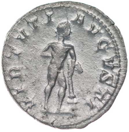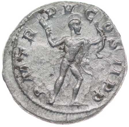 125. AR Antoninianus, Rv:"P.M.TR.P.II.COS.P.P.", stojící