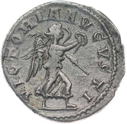 165. AR Antoninianus, Rv:"VICTORIA.AVGG.", kráčející Victoria zprava