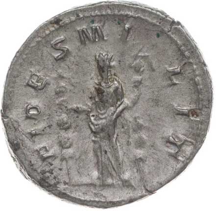 112. AR Antoninianus, Rv:"FIDES MILITVM" stojící Fides zleva