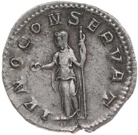 170. AR Antoninianus, Rv:"IVNO CONSERVAT", stojící Juno