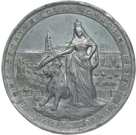 Poprsí mírně zleva, opis / stojící Čechie se lvem, Pražský Hrad,