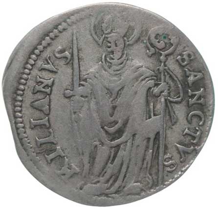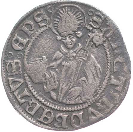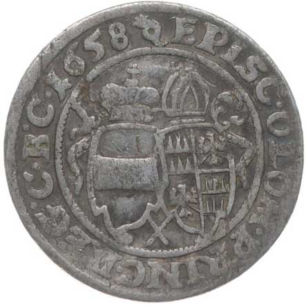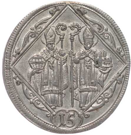494. 1/2 Batzen (2 Krejcar) 1650, čtyřdílný znak, opis / stojící sv.Kilián,