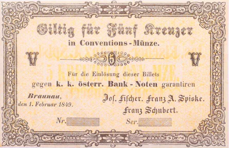 | 1148. | Broumov (Braunau), 5 Krejcar 1.2.1849, J.Fischer, F.A.Spiske,