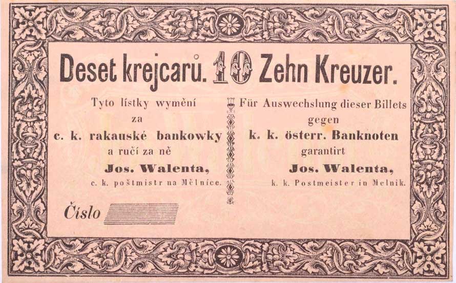 | 1165. | Mělník (Melnik) - 10 Kr.C.M., b.l., Jos.Walenta, c.k. poštmistr