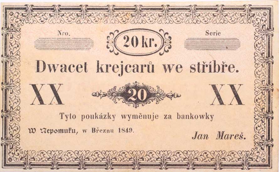 | 1166. | Nepomuk - 20 Kr.stř. III.1849, Jan Mareš, bez série, čísla a podpisu