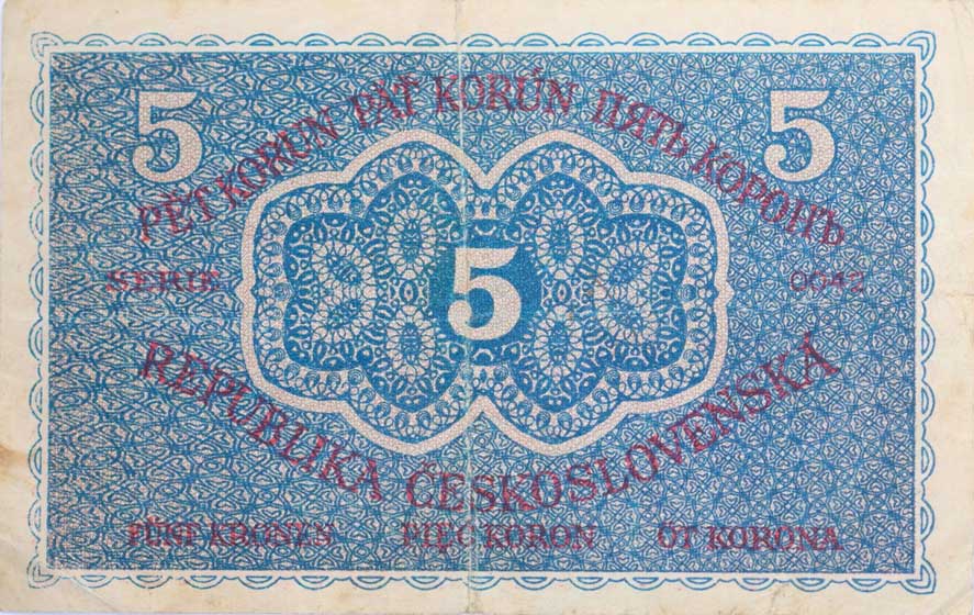 5 Kč 1919, série 0121, B.8, Hejzl.8a 3x natrž., odřený tisk "neperf." |