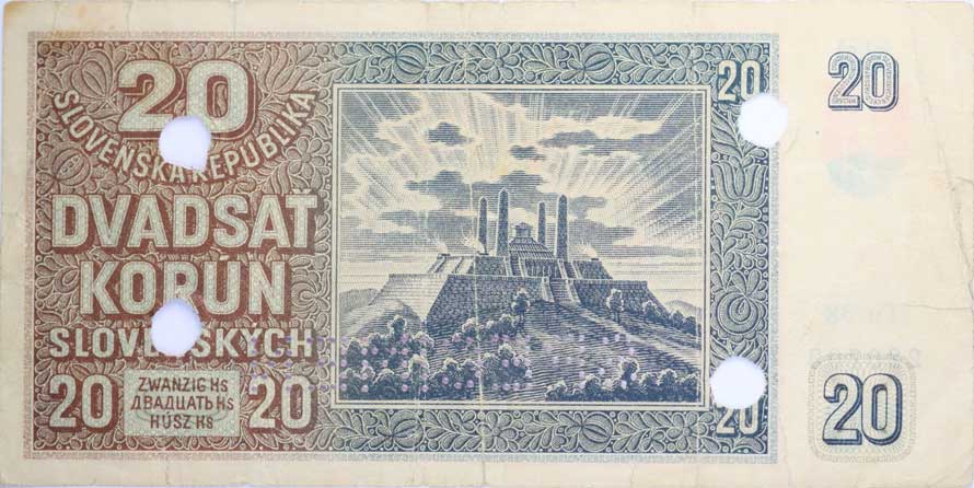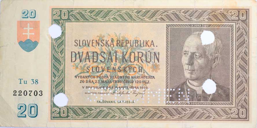 1 Koruna (1940) - série C041, B.30, Hejz.30a "neperf." 20 Koruna 1944 - série 09A, B.40a, Hejz.40a "neperf." |