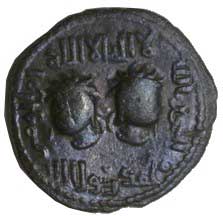 382. AE dirham 32 mm A: Dvě hlavy čelně, okolo Kalima R: Hlava čelně,