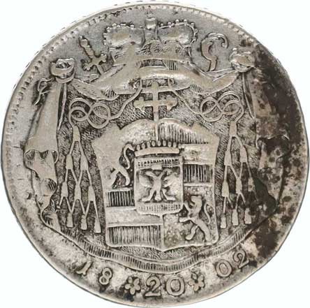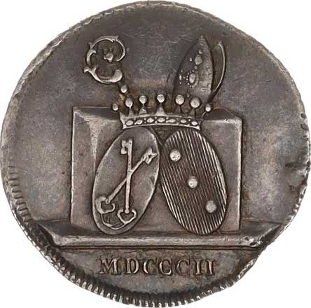 1802, 11-řádkový nápis / Dva znaky s berlou a mitrou v ex. letopo čet Ag 23 mm 2,218g Don.4698; Přibil 692 vada stř. hr. |