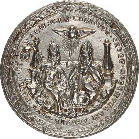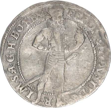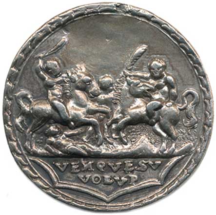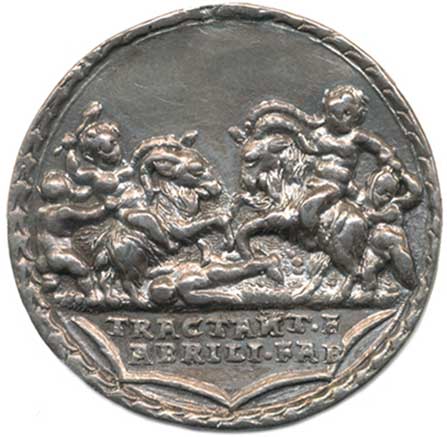 ší nahé postavy. VENQVESV / VOLVP / R: dva nazí jezdci sedící na kozorozích bojují s okolními postavami TRACTANT . F / ABRILI . FAB Ag 33,5 mm 14,32 g "RR" |
