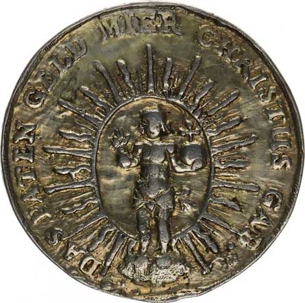 tojící Kristus s královským jablkem, kolem něj gloriola s paprsky a plamínky Ag litá 35 mm 13,088 g tém. |