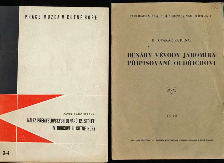 Kutné Hory 28 str. +příloha; 2/ Dtto: Příspěvek k počátkům morav ského mincovnictví vyd. Brno 1957 4 str.; 3/ Polívka Ed.: Pad ělek denárů knížete Václava vyd. Praha 1966 8 str.; 4/ Kudrna: Deníry vévody Jaromíra připisované Oldřichovi vyd. 1948 8 str. |