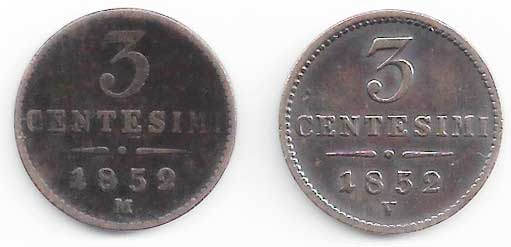 | 111. | 3 Centesimi 1852 M, V, Nov.:92 2 ks | -1 až 2- | 60,- | 170,- |