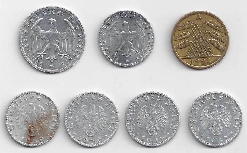 3.říše, 50 Pf 1939J-2x, 1941 G, 1942 F, KM:96 7 ks |