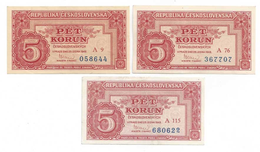 | 307. | 5 Kč 1949, sér.A9, A76, A115, neperfor., H:83a1, a2, a3, 3 ks | N | 1200,- | --.- |