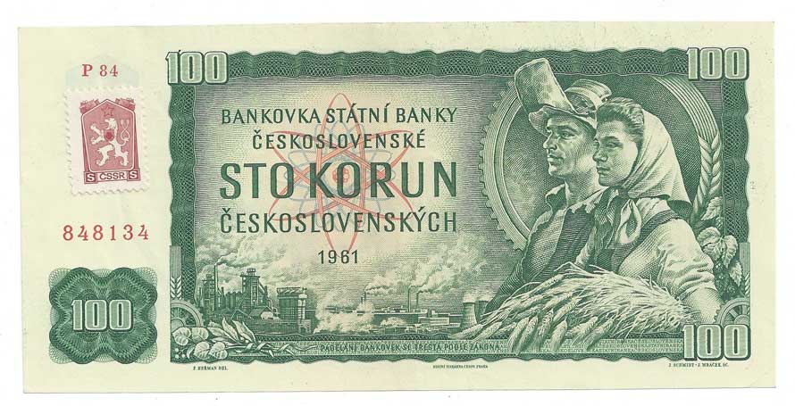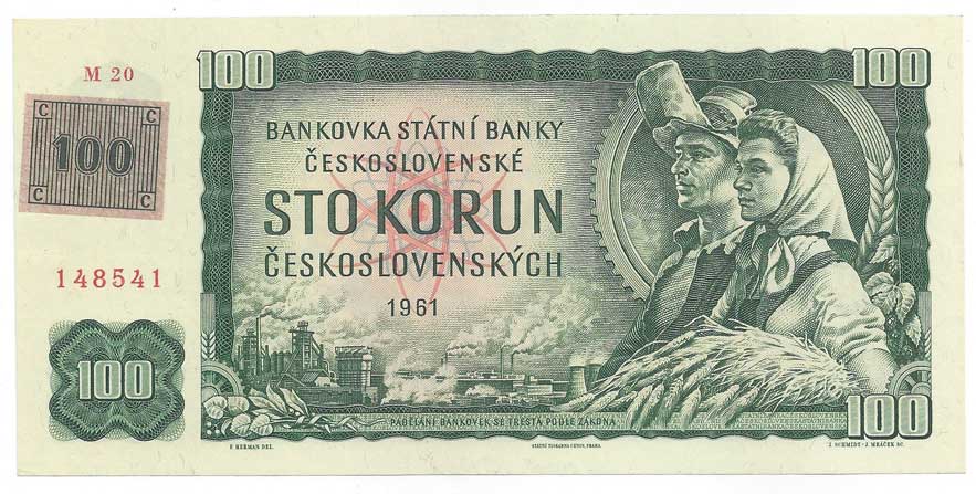 | 323. | 100 Kč 1961 II. vyd., sér.M14- přelepeno, kolek český 1993,