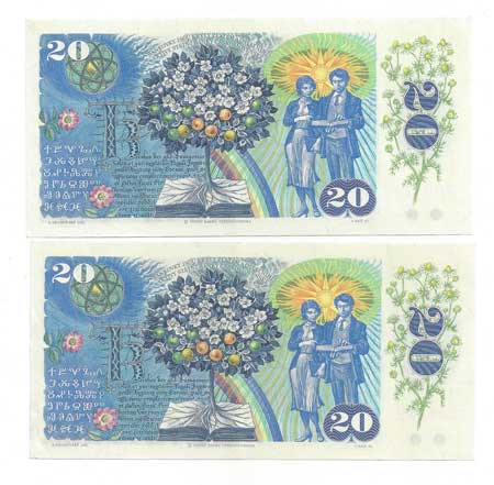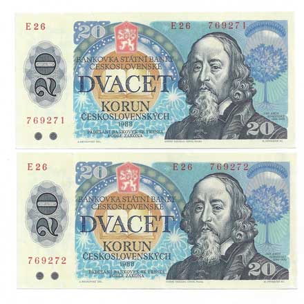 | 315. | 20 Kčs 1988, sér.E 26, H:109a, 2 ks - postupka, 1x zc.nep. ohnutá str. | N až N- | 360,- | 360,- |
