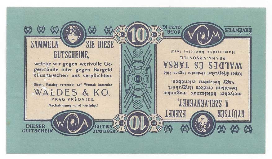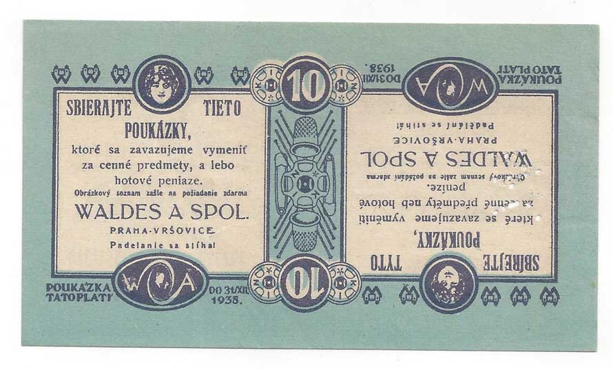 | 320. | Waldes a spol., poukázka na 10 jednotek, platné do 31.12.1938,