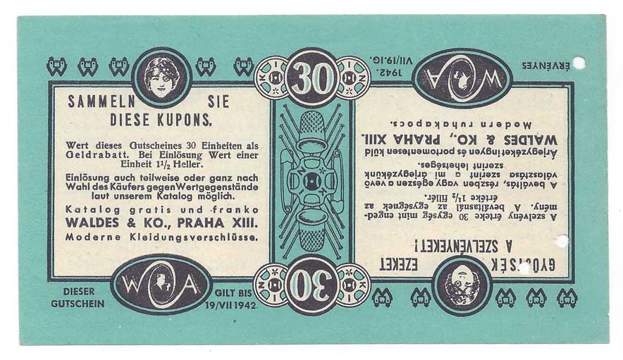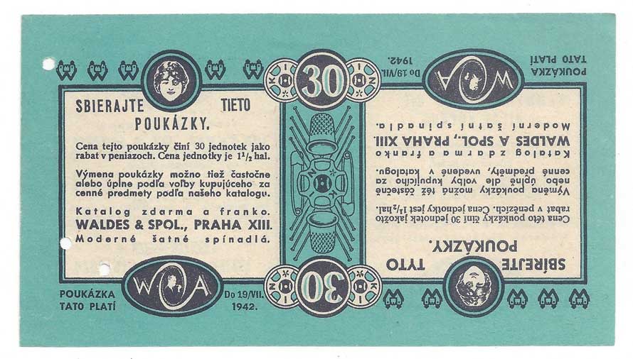 | 321. | Waldes a spol., poukázka na 30 jednotek, platné do 19.7.1942,