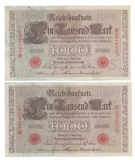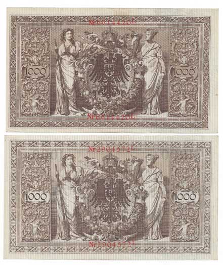 | 327. | 1000 Mark 1910, 7místný číslovač, Pick:45, 1x nep.zvln. okraj 2 ks | N- | 140,- | --.- |