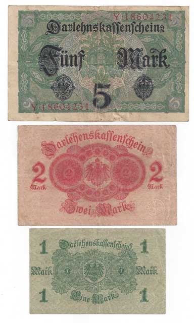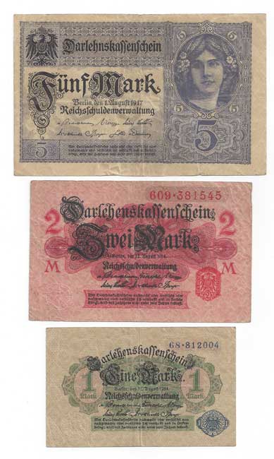 | 328. | 1 M 1914, I. vyd., Pick:51, 2x přel., 2 M 1914, II.vyd,. Pick:54,