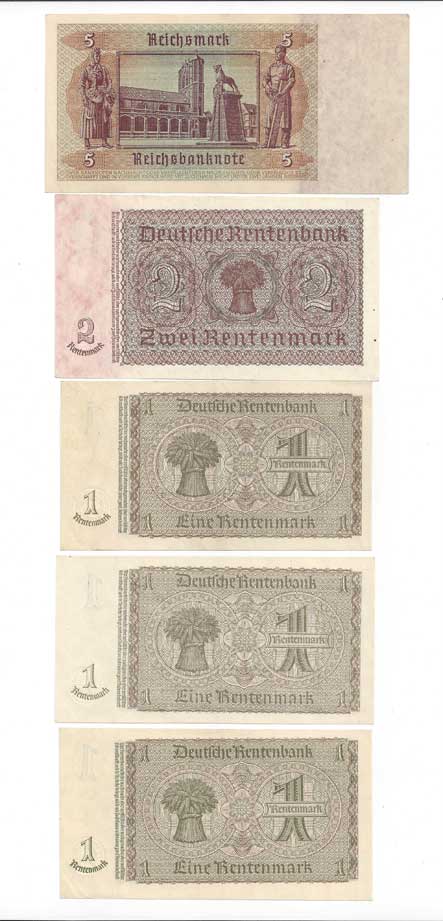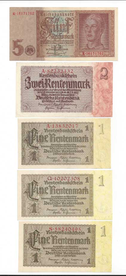2 Rentenmark 1937, Pick:174, 1/5 bankovky obarvena 5 RM 1942, Pick:186, 2x přel. celkem 5 ks |