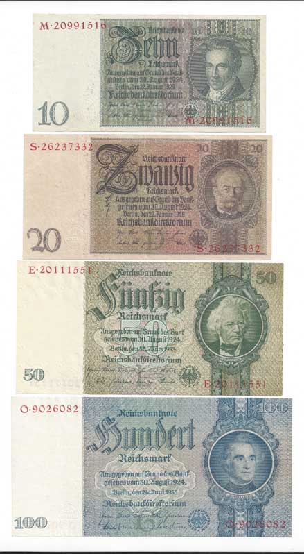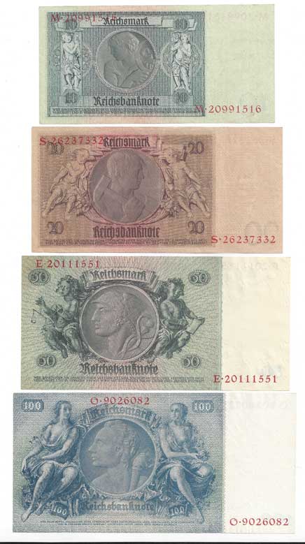 | 331. | 10,20,50 a 100 RM bl.(1945), mírové vyd., sér.M,S,E,O, Pick:180,181,