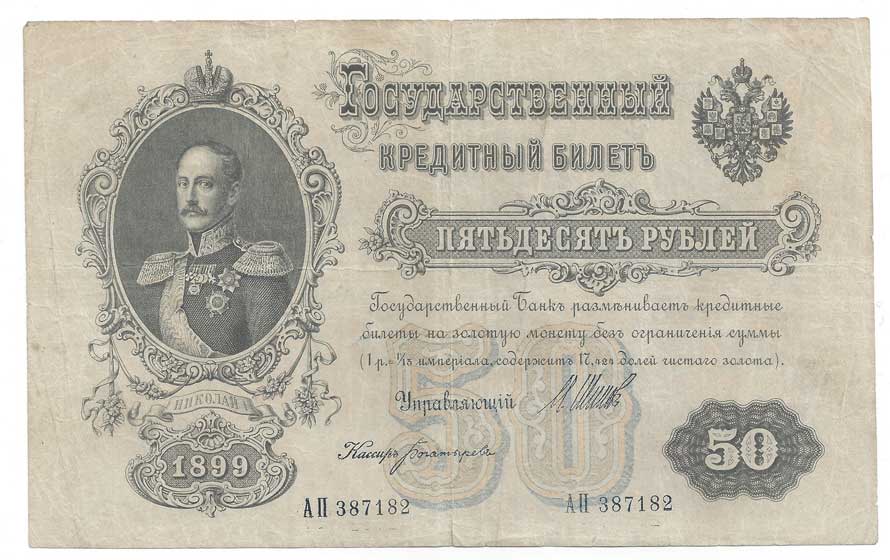 | 335. | 50 Rublů 1899, Šipov, sér.AP, Pick:8d, 2x přel. | 2 | 30,- | 400,- |