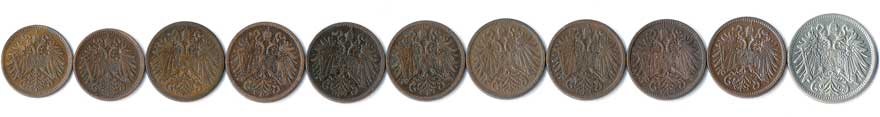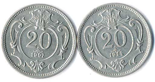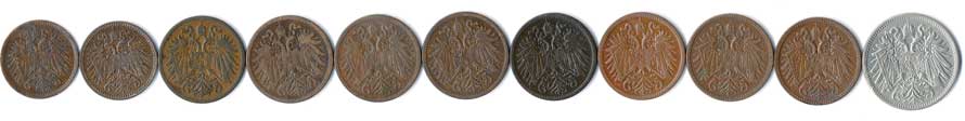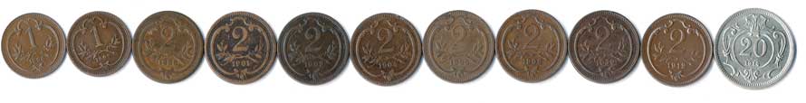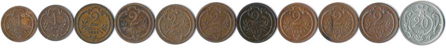 | 340. | 1 Haléř 1898,1916, 2 Haléř 1897,98,1903,05,07,09,13, 20 Haléř 1914, 11ks | 1-1- | 320,- | 320,- |