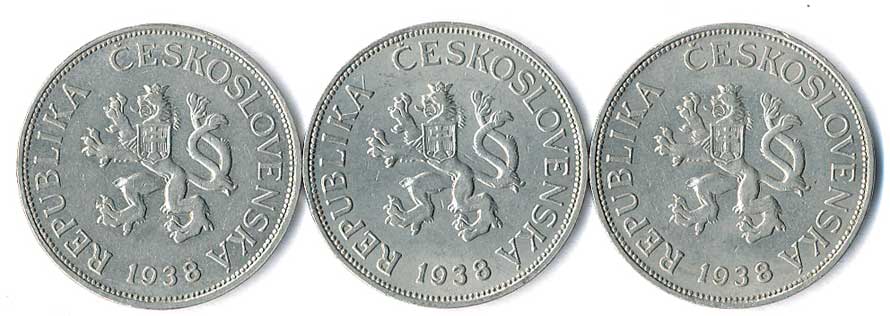 | 456. | 5 Kč 1938, 3 varianty, vlnovky z Av., vlnovky z Rv., vlnovky u sebe, 3ks | 0-1 | 260,- | --.- |