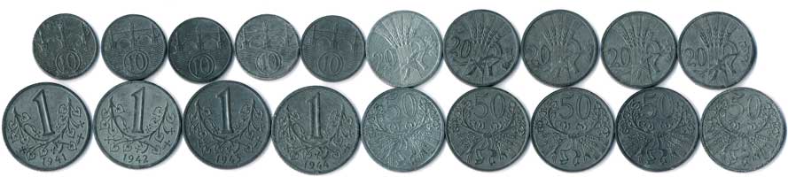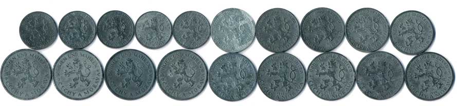 | 460. | 10,20,50 haléř, 1 Koruna, kompletní protektorátní série, celkem 19 mincí | 1-1- | 200,- | 1600,- |