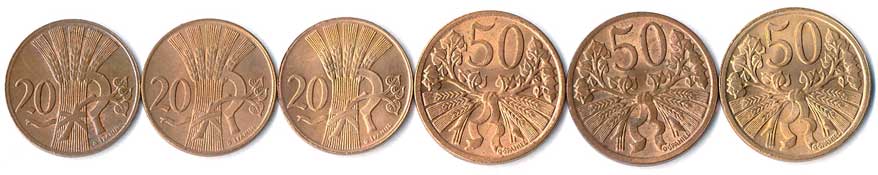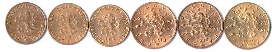 | 495. | 20 haléř 1948,49,50, 50 haléř 1947,48,50, začínhající patina 6ks | 0/0 | 180,- | 320,- |