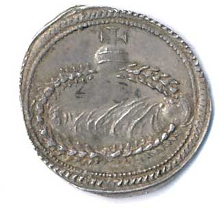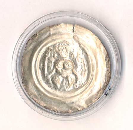 byly kupovány při křtu, připevňovaly se na svíčku a měly ochraňovat novorozence, ve vavřínovém věnci ležící Ježíšek / 3 v paprscích, zkřížené pochodně propletené vavřínem, Ag 15,5mm/0,96g, patina, poměrně vzácná ražba |