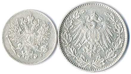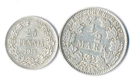 | 812. | 25 Penniä 1915, 1/2 Mark 1914 J, 2ks | 1-1- | 120,- | --.- |