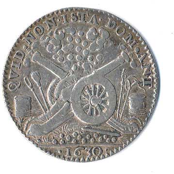 korunovaný erb, kolany, opis / dvě děla, sudy s prachem, koule, dole 1630, Ag27 |