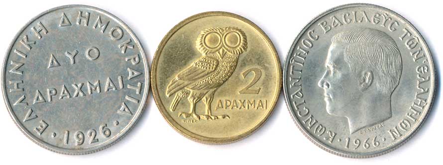 | 907. | 2 Drachma 1926, Athéna, 1973, sova, 5 Drachma 1966, Constantin II., 3ks | 0/0 | 50,- | --.- |