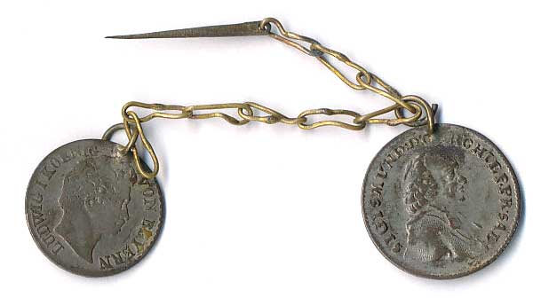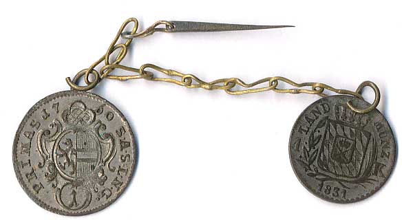 | 910. | 1 Kr.1775 + 1 Kr.1831(Bavorsko), mince na řetízku se špendlíkem (pěkná kuriozita) | 1-1- | 60,- | 60,- |