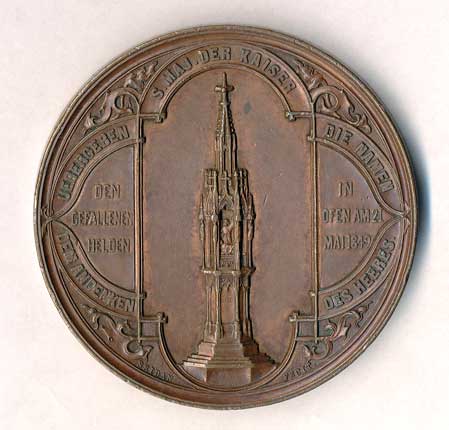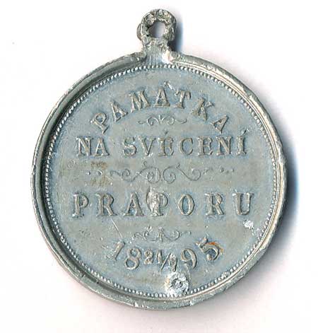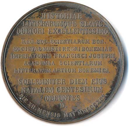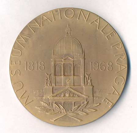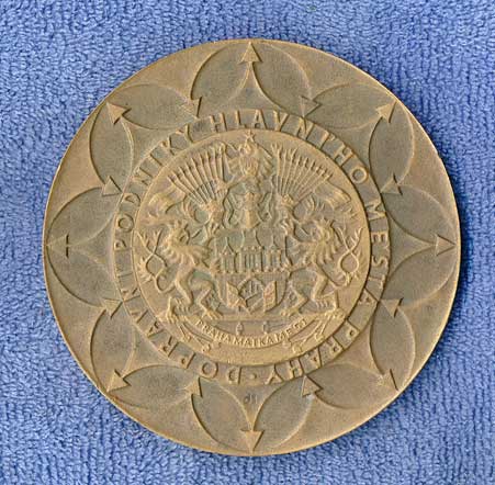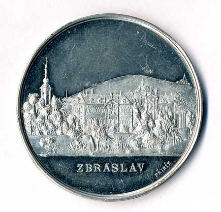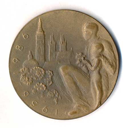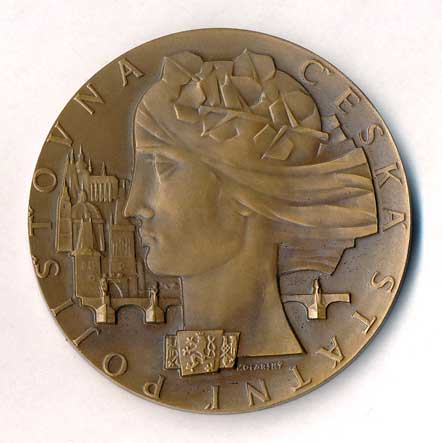 hlava zleva, v pozadí pražské památky , opis / ruce drtící ratolest, datace, opis, Br60 |