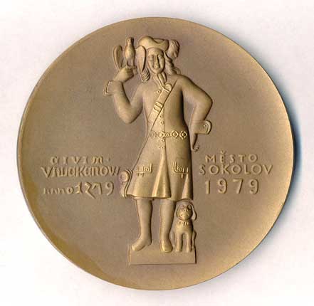 | 1509. | 700 let města Sokolov-stojící muž se psem a sokolem čelně, náp., datace / sokol,