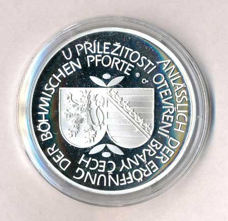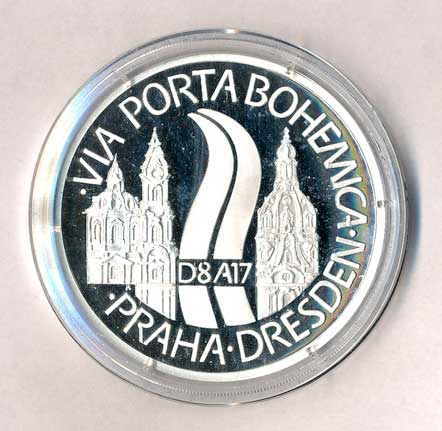 Stavby silnic a železnic - dálnice Praha-Drážďany - otevření brány Čech - stavby obou měst, dálnice, opis / erby zúčastněných, dvojjaz.opis, Ag50/42g, certifikát kapsle, etue, 180ks, na hraně 3x datum 21.12.2006, (Oppl V.+ Doubek F.) |