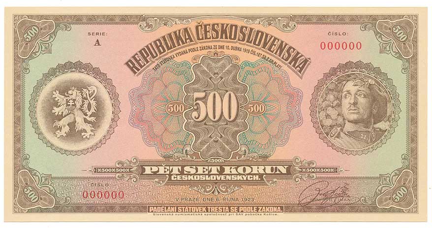 | 2023. | 500 Kč 1923, s.A 000000, anulát, replika SNS Košice 1923, zelené desky | N | 900,- | --.- |