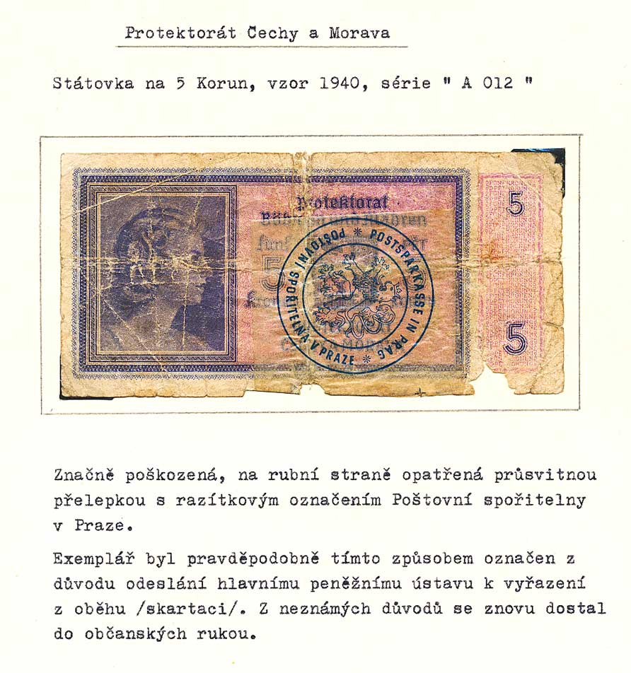 | 2032. | 5 K (1940) s.A012, určená ke skartaci, protektorátní přelepka spořitelny | 5 | 50,- | --.- |