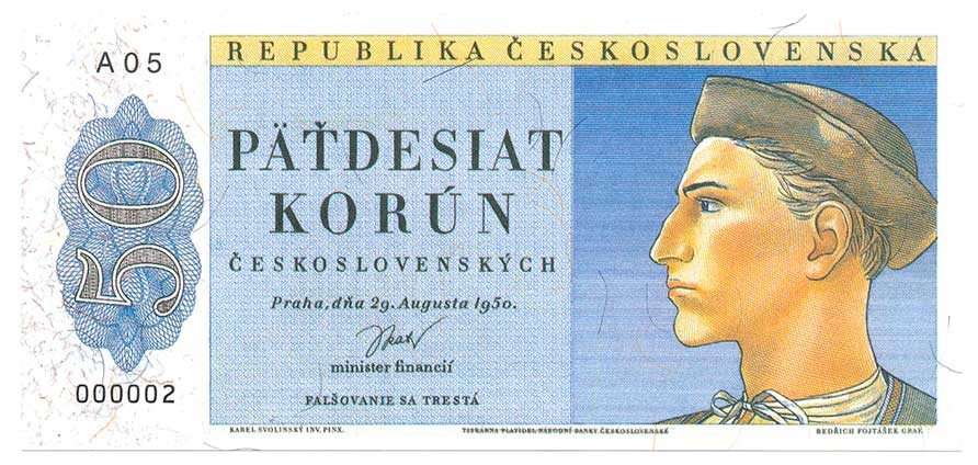 | 2068. | 50 Kčs 1950, s.A05, Jánošík, oficiální faksimile nevydané bankovky (ENA) | N | 300,- | 300,- |