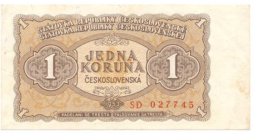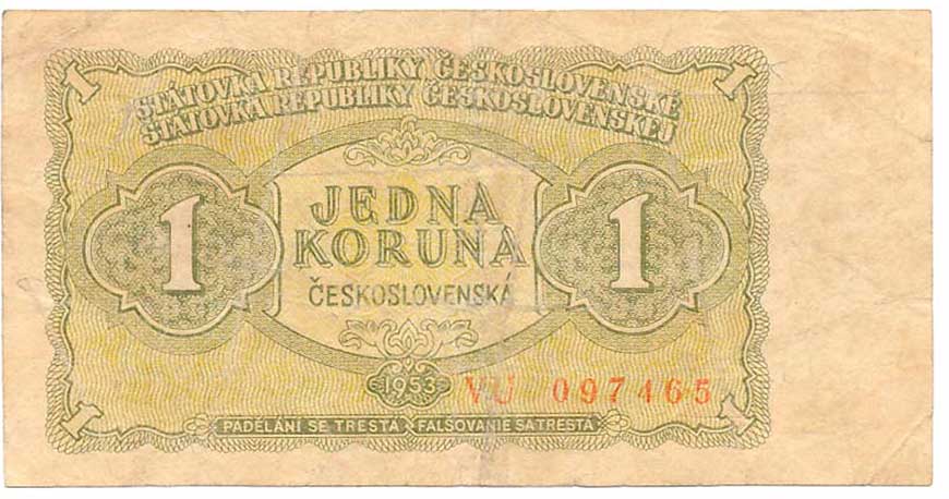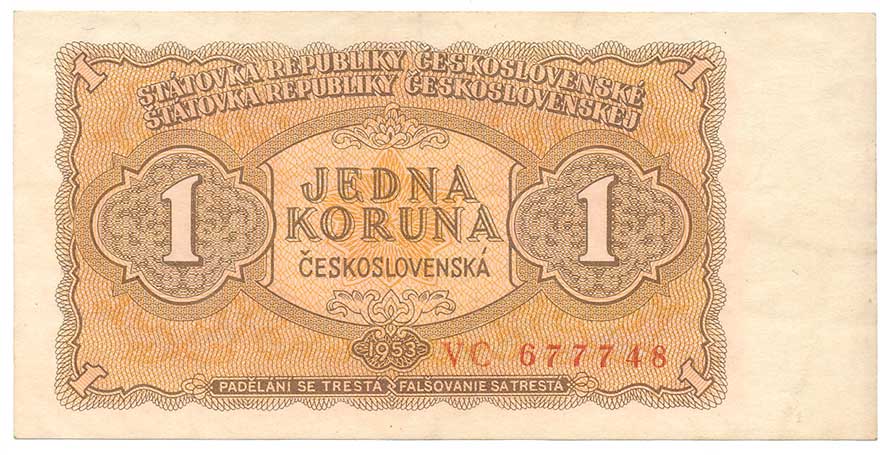 | 2079. | 1 Kčs 1953 s.VU, ČSR, žluto zelený tisk | 3- | 50,- | 50,- |