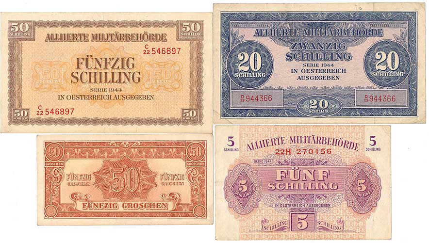 | 2118. | Rakousko - 50 Grosch., 5,20,50 Schilling 1944, Alliierte Militärbehorde, 4ks | 2-2- | 100,- | --.- |