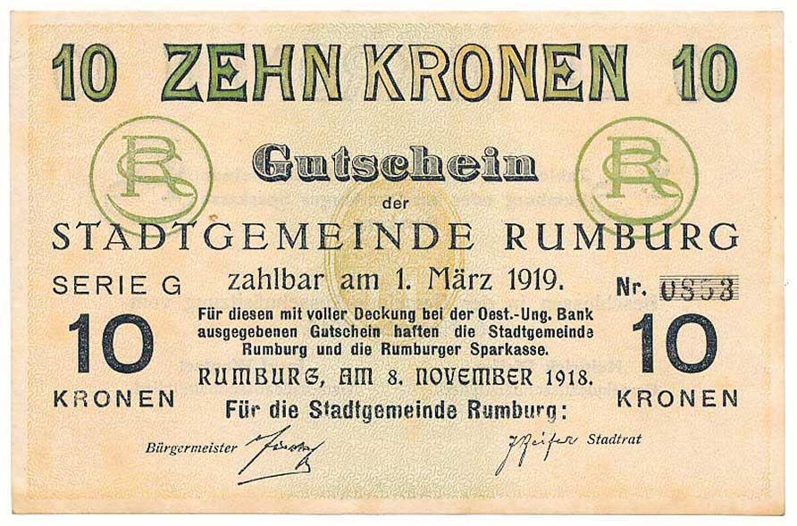 | 2119. | 10 Kronen 1.11.1918, Stadtgemeine Rumburg | N-0 | 360,- | --.- |