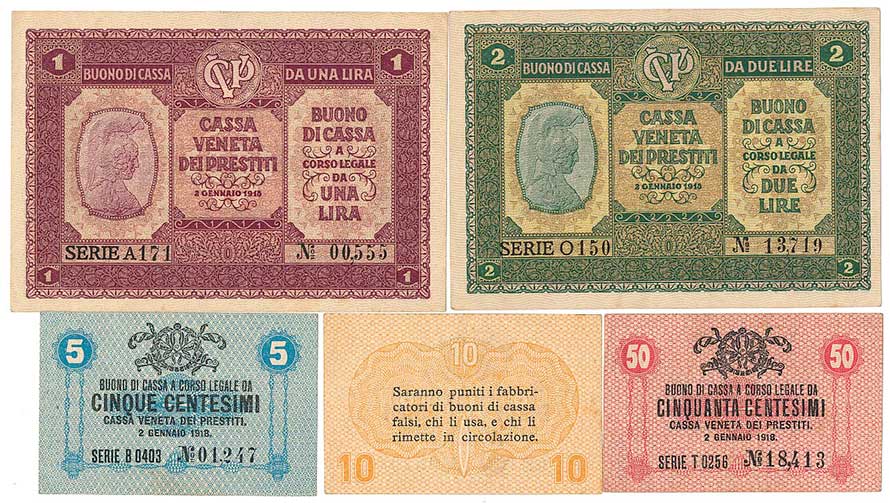 | 2123. | 5,10,50 Ct. (1-2), 1 a 2 Lira, Casa Venetia dei prestiti 2.1.1918, 5ks | 0-1 | 140,- | 140,- |