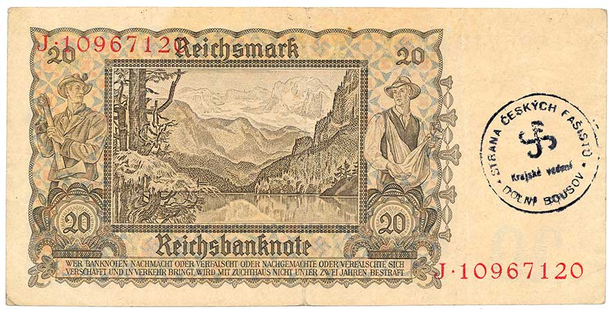 na reverzu razítko:" Strana českých fašistů, Krajské vedení, Dolní Bouzov |
